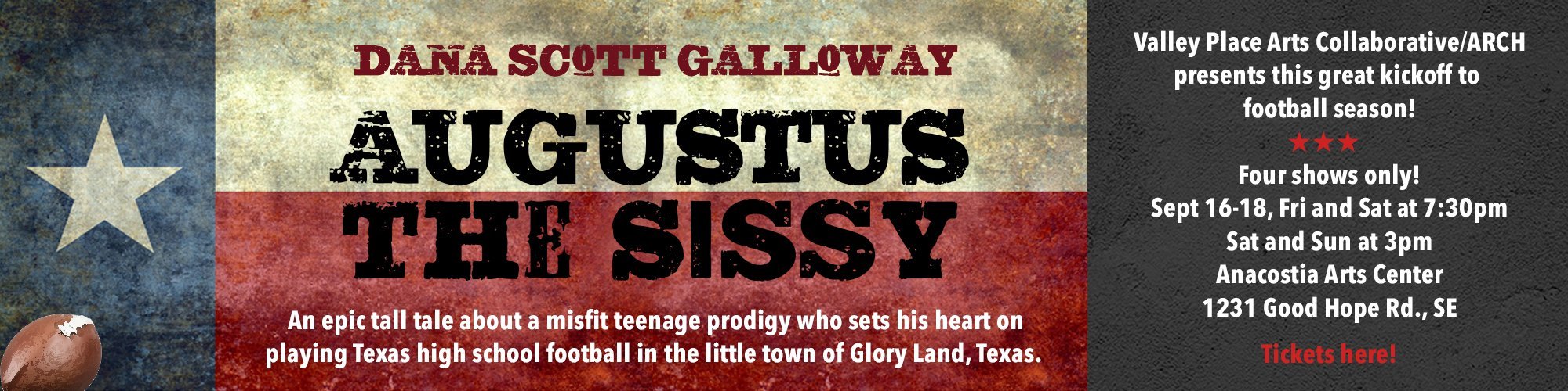 Kick off the football season with this solo show that’s an epic tall tale told in verse, about a misfit teenage prodigy who sets his heart on playing Texas high school football in the little town of Glory Land, Texas.